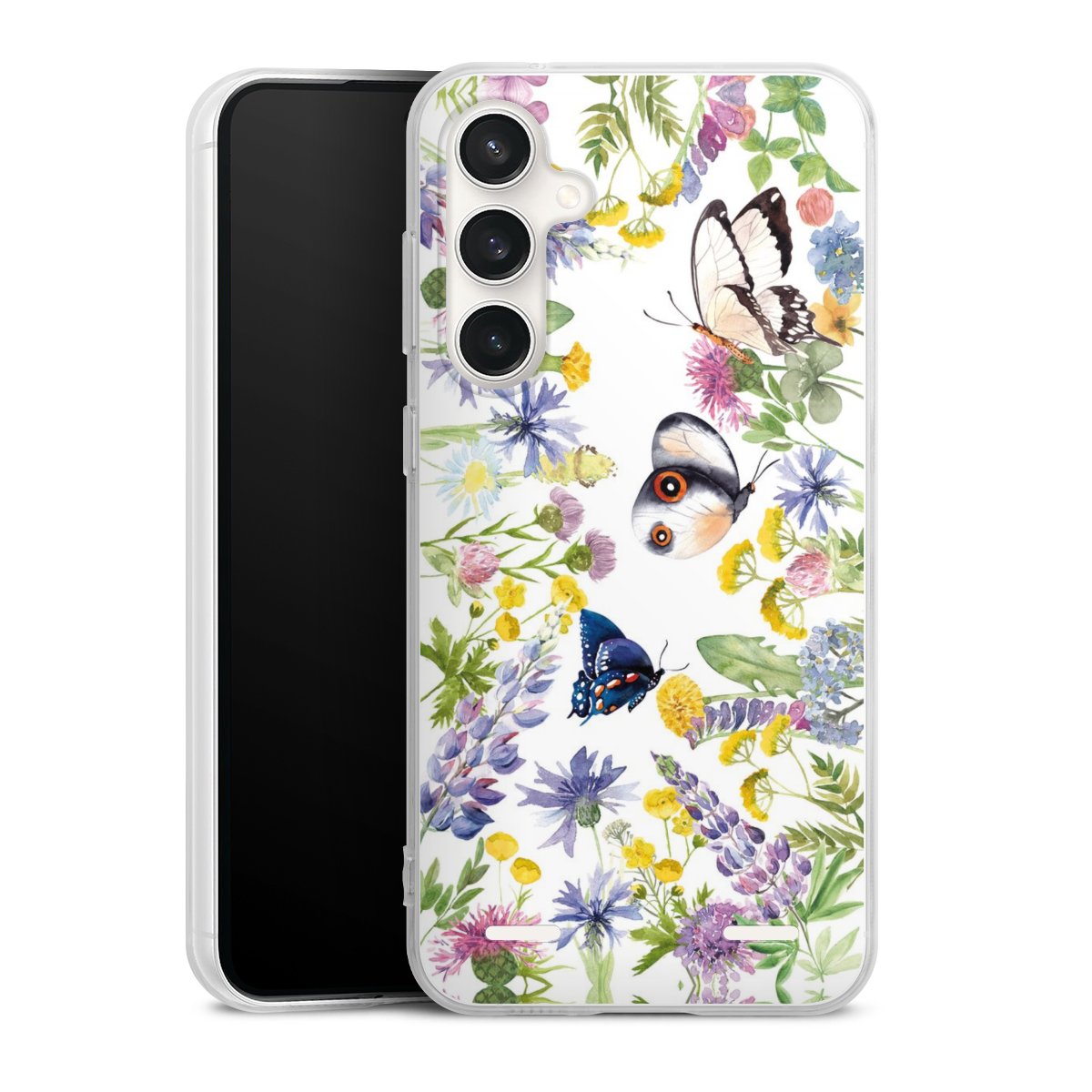 Bunte Frühlingsblumen und Schmetterlinge