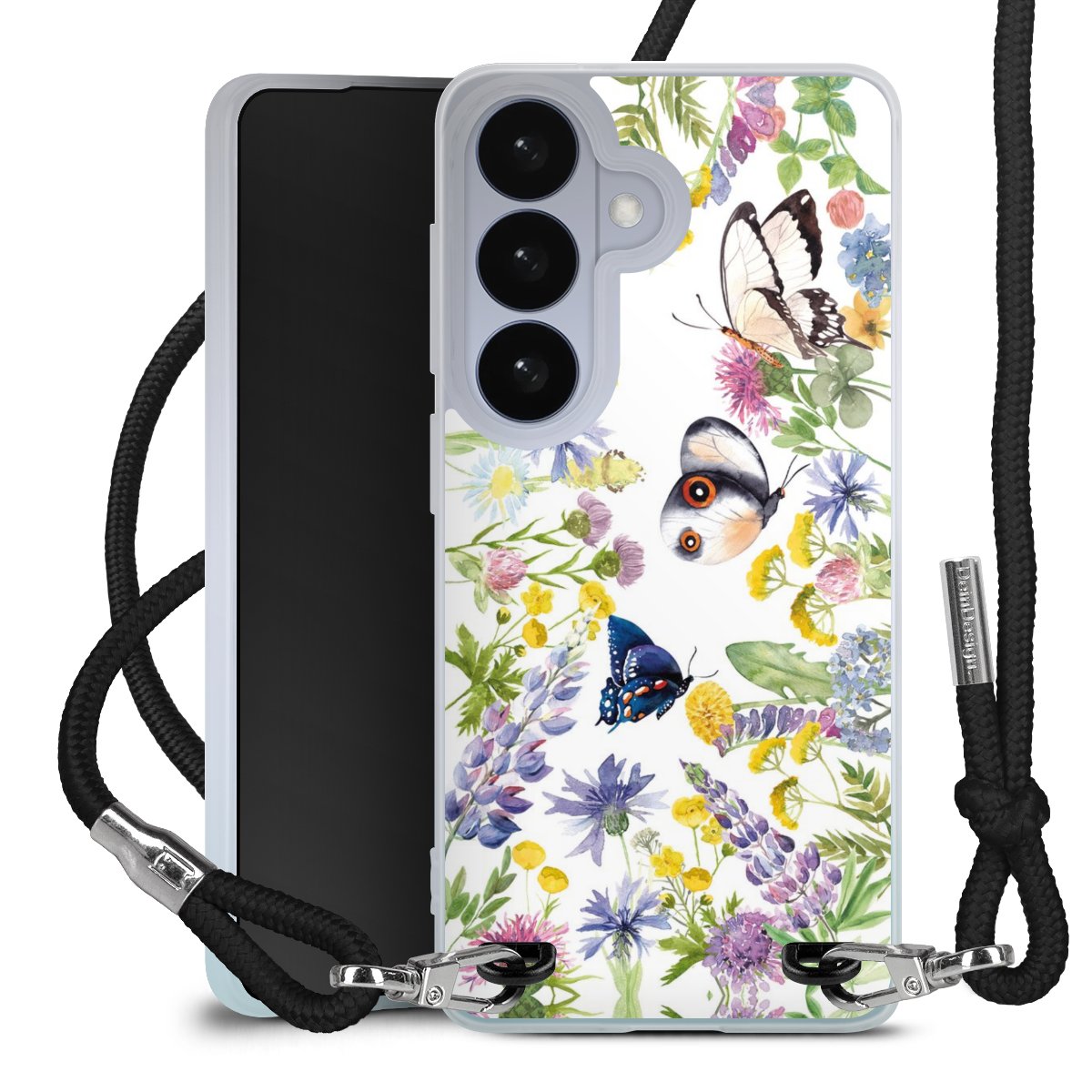 Bunte Frühlingsblumen und Schmetterlinge