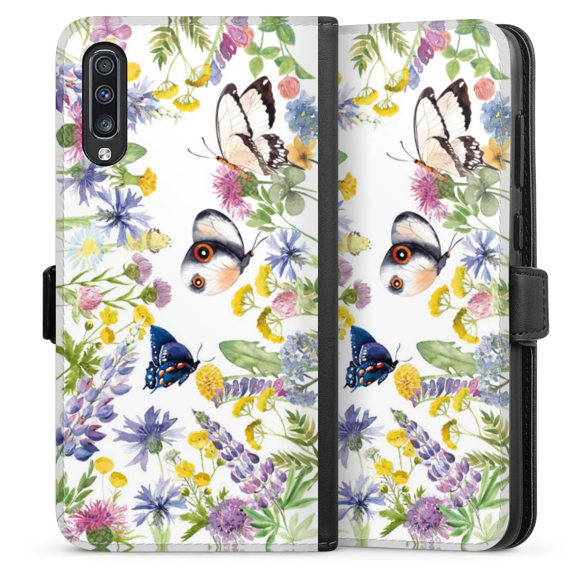 Bunte Frühlingsblumen und Schmetterlinge