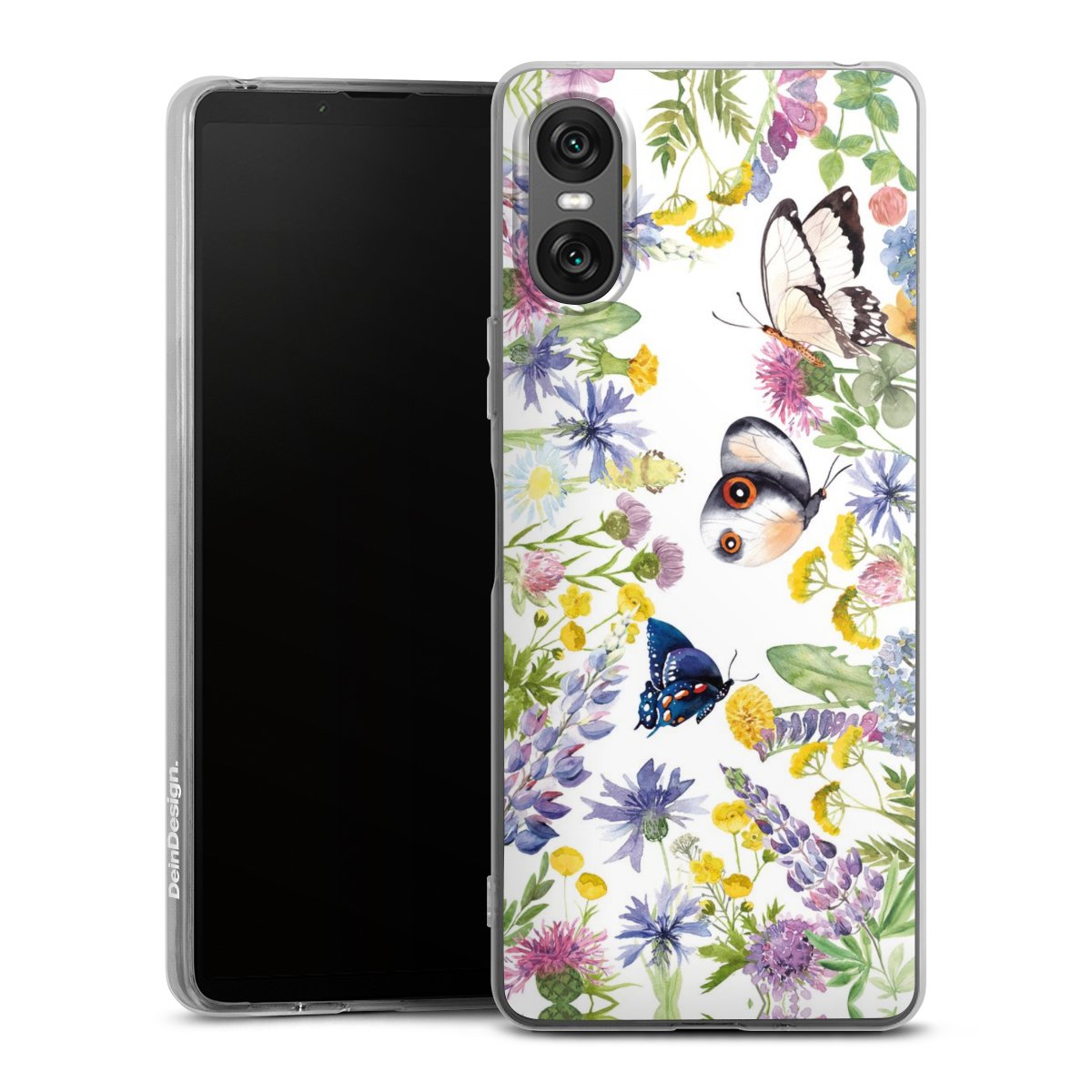 Bunte Frühlingsblumen und Schmetterlinge