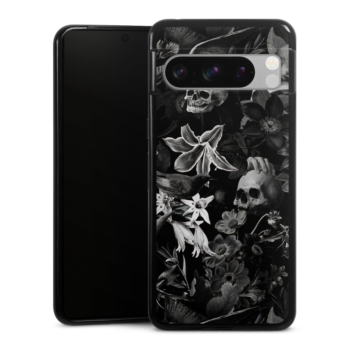 Skulls and Flowers on Black Background