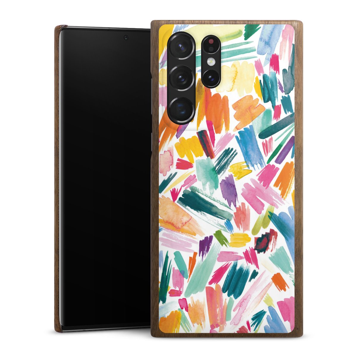 Printteknik För vårt Wooden Slim Case använder vi vår avancerade direkta printteknik. Baksidan är helt printbar, ramen lämnas oprintad. Du kan beställa skalet utan print, helt eller delvis printad. Välj en av våra exklusiva, färdiga designer eller låt din kreativitet flöda och skapa din egen unika design med dina bilder, lager och text.